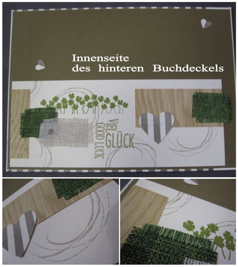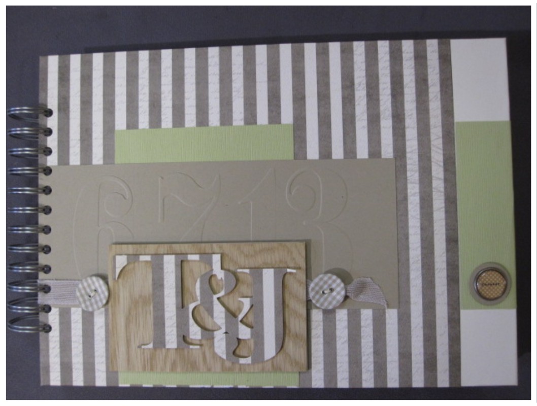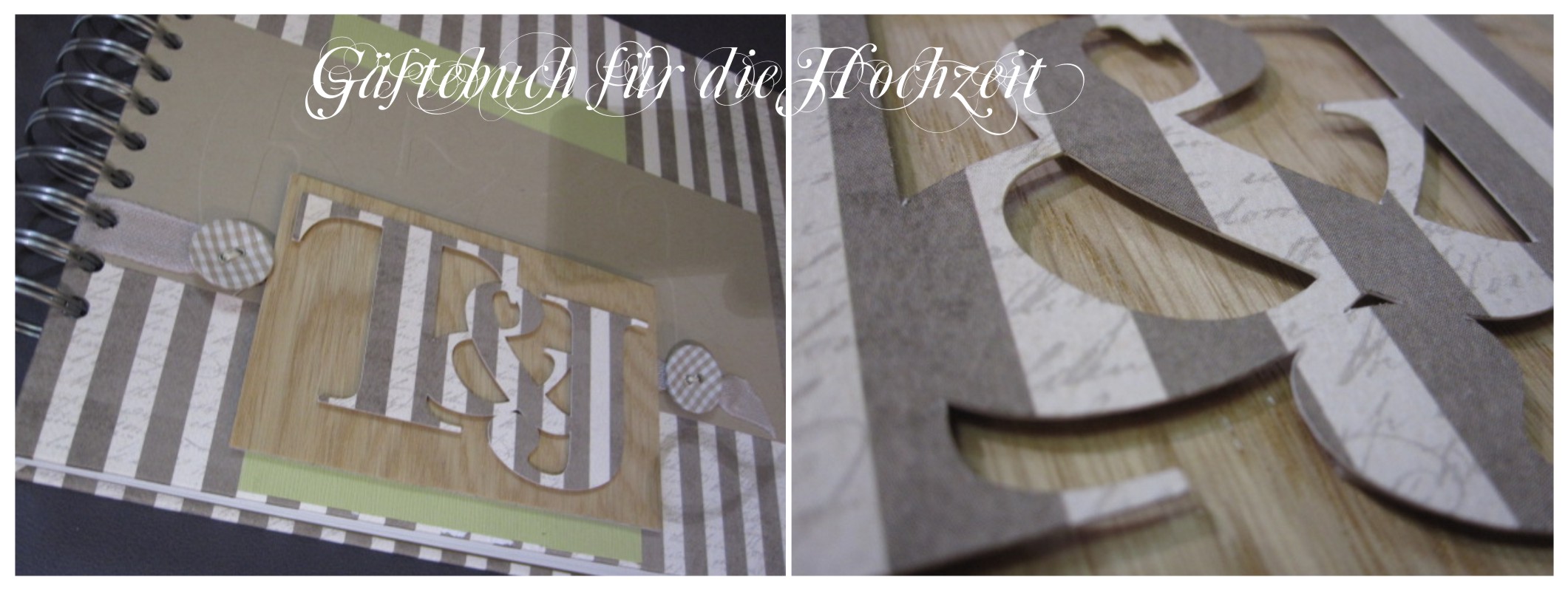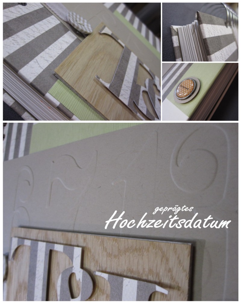Für dieses Gästebuch bekam jeder Hochzeitsgast ein A4-Blatt im Vorfeld zugesand und so konnte jeder seine ganz persönliche Seite, mit allen guten Wünschen für das Hochzeitspaar gestalten. Alle Seiten – ups, es waren 50 Stück, brauchten nun einen schönen Buchdeckel. Ich hielt mich an die Farbe der Einladungskarten und an den gewünschten Landhausstil – es wurde ein sehr individuelles Gästebuch mit einer Kombination aus Papier und echtem Furnier. Das Hochzeitsdatum ist im Hintergund geprägt und die Initialen sind mit der CAMEO ausgeschnitten.
