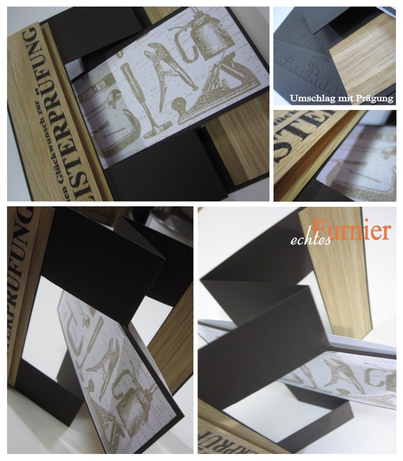 Besonderes, Festliches Drehkarte 18. September 2013 / Meisterprüfung als Schreiner bestanden! Da mußte eine besondere Karte gewerkelt werden! Echtes Furnier und Stempel von SU waren ideal für diese Drehkarte.