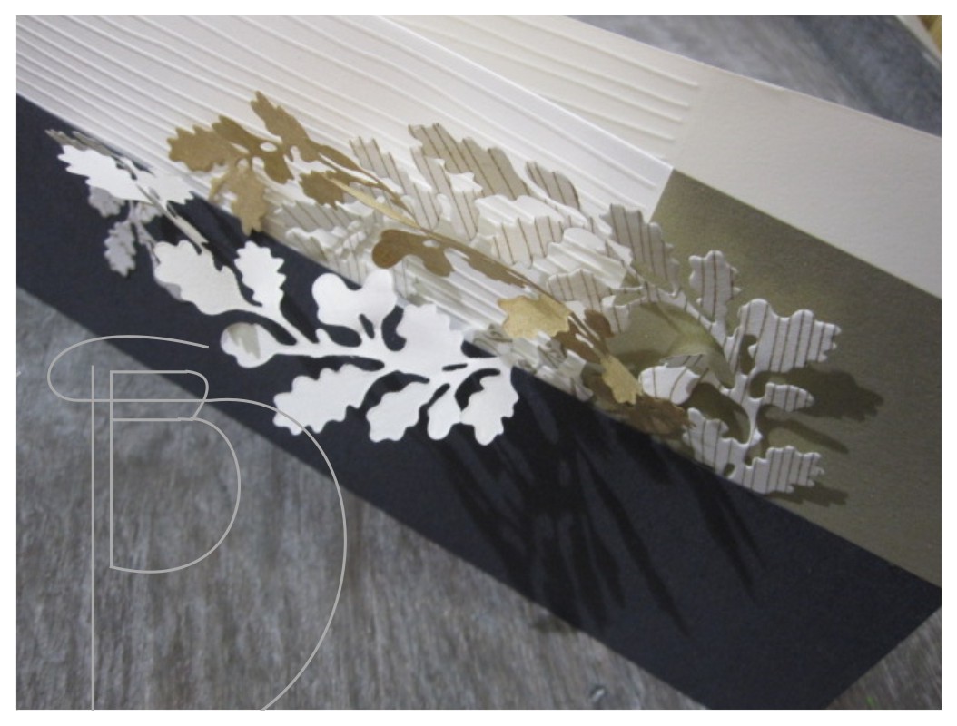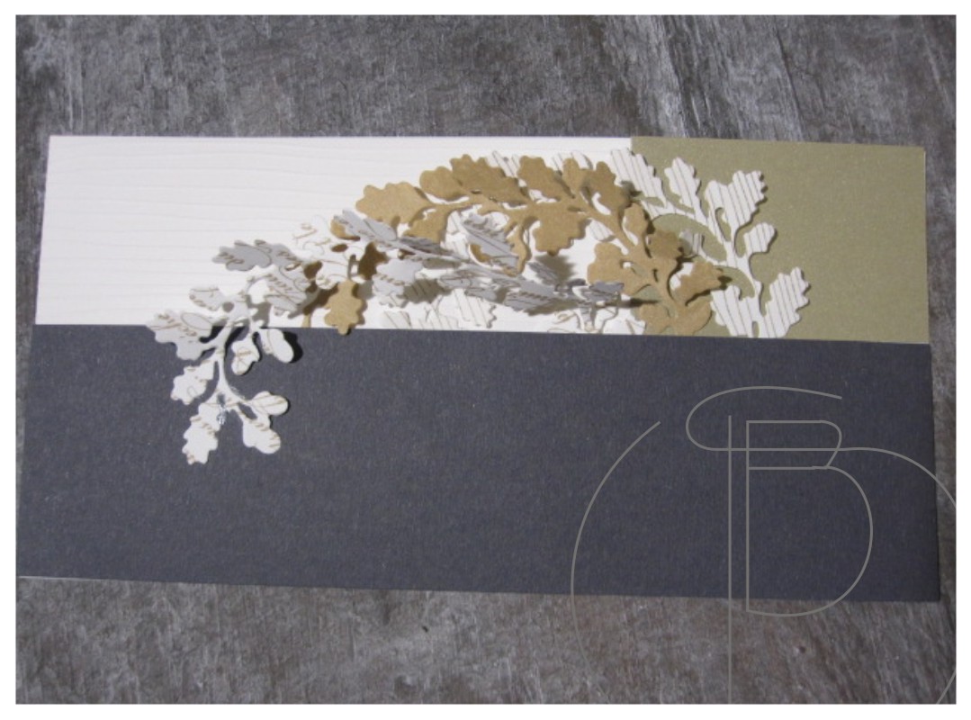 Das weiße Laub war mir zu hart, da hab ich es mit einem Hintergrundstempel „Holz“ und „Schrift“ von SU in Savanne (SU) bestempelt. Die kleine Stanze ist sehr verwandlungsfähig – hab ich auch erst entdeckt.
